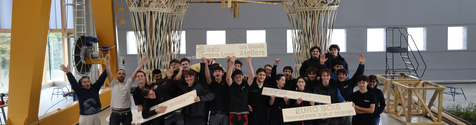 En septembre dernier, GL Events – Eurobois a confié à L’École Supérieure du Bois une mission inhabituelle : créer une arche monumentale pour marquer l’entrée de leur salon professionnel. Une opportunité parfaite pour le « Speed Défi », exercice pédagogique phare du Bachelor. Les étudiants doivent répondre à une commande client réelle en seulement une semaine.