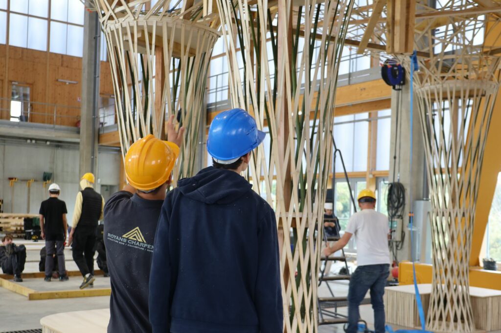 Les contraintes étaient nombreuses et exigeantes. L’arche devait résister à un passage intensif dans un établissement recevant du public, être esthétique, transportable, montable et démontable en une journée, et surtout, être réalisée localement à partir de matériaux biosourcés. Aussi, le choix s’est naturellement porté sur le bois et le bambou provenant de bambouseraies françaises, incarnant parfaitement les valeurs de la filière.