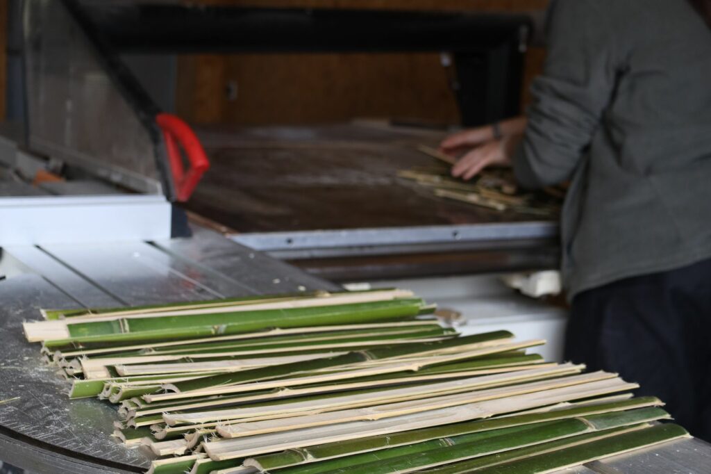 Jour 2 – L’organisation Direction Villefontaine et le plateau technique des Grands Ateliers. Les étudiants se répartissent les tâches avec méthode. Élaboration des plans de conception, programmation des usinages sur la commande numérique 5 axes, transformation minutieuse de 60 cannes de bambou en 360 lames, réflexion sur les solutions de lestage. Ils débutent également la fabrication des structures.